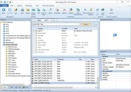 Looking for a reliable and powerful disk catalog software to organize your huge collection of disks? WinCatalog 2023 disk cataloger is a perfect solution! On the market since 2001. Automatically create a catalog of all files, stored on your disks (HDDs, DVDs, CDs, network drives and other media storage devices): WinCatalog will automatically grab ID3 tags for music files, Exif tags and thumbnails for photos, thumbnails and basic information for video files, e-books, contents of archive files, thumbnails for images (pictures) and PDF files, ISO files, and much more.