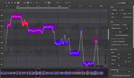 Vovious is a vocal-editing and pitch-correction tool that combines. neural-network pitch detection with a modern, DAW-integrated interface. It allows precise control over pitch, slope, vibrato, formants, and amplitude, and it includes advanced tools such as freehand pitch drawing and a temporary-note editor for micro-level adjustments. Timing can be corrected visually through a color-coded grid that shows how notes fit the beat, and sibilants, breaths, and noise can be edited independently for a clean, natural sound.