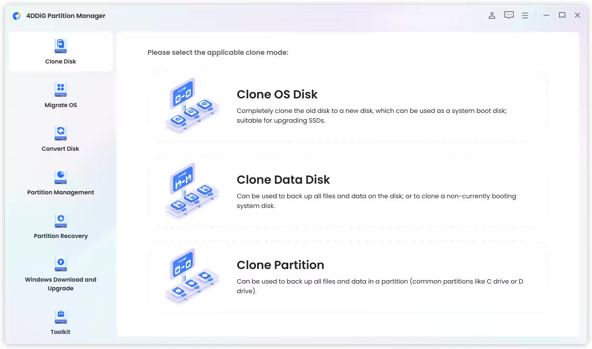 4DDiG Partition Manager is a powerful and easy-to-use Windows disk partition management software, designed for system migration, disk cloning, and partition optimization. It is suitable for both beginners and advanced users who need a safe and efficient solution for managing disks and transferring data.